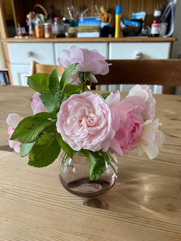 I am enjoying the warmer days. The joint and muscle pain I experience with fibromyalgia seems to be soothed by the warmth and humidity. In recent years, I’ve noticed the air on summer mornings being fragrant, and I love stepping outside to be received by it. In the evenings, I stand with bare feet on the lawn and water our plants. It has been very dry.